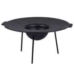 En dát brengt ons weer bij onze gietijzeren grillschaal! Deze is niet alleen geweldig om te zien, maar ook nog eens heel functioneel! Een soort omgekeerde sombrerohoed op pootjes. Zet ‘m boven een kring van gloeiende briketten en leg de ring vol met sateetjes en stukjes stokbrood. Het ‘bolletje’ kun je vervolgens gebruiken om bijvoorbeeld een lekker satésausje in te maken. Of maak een vuurtje onder het bolletje en bereid een soepje of (vlees)fondue. Handig he!